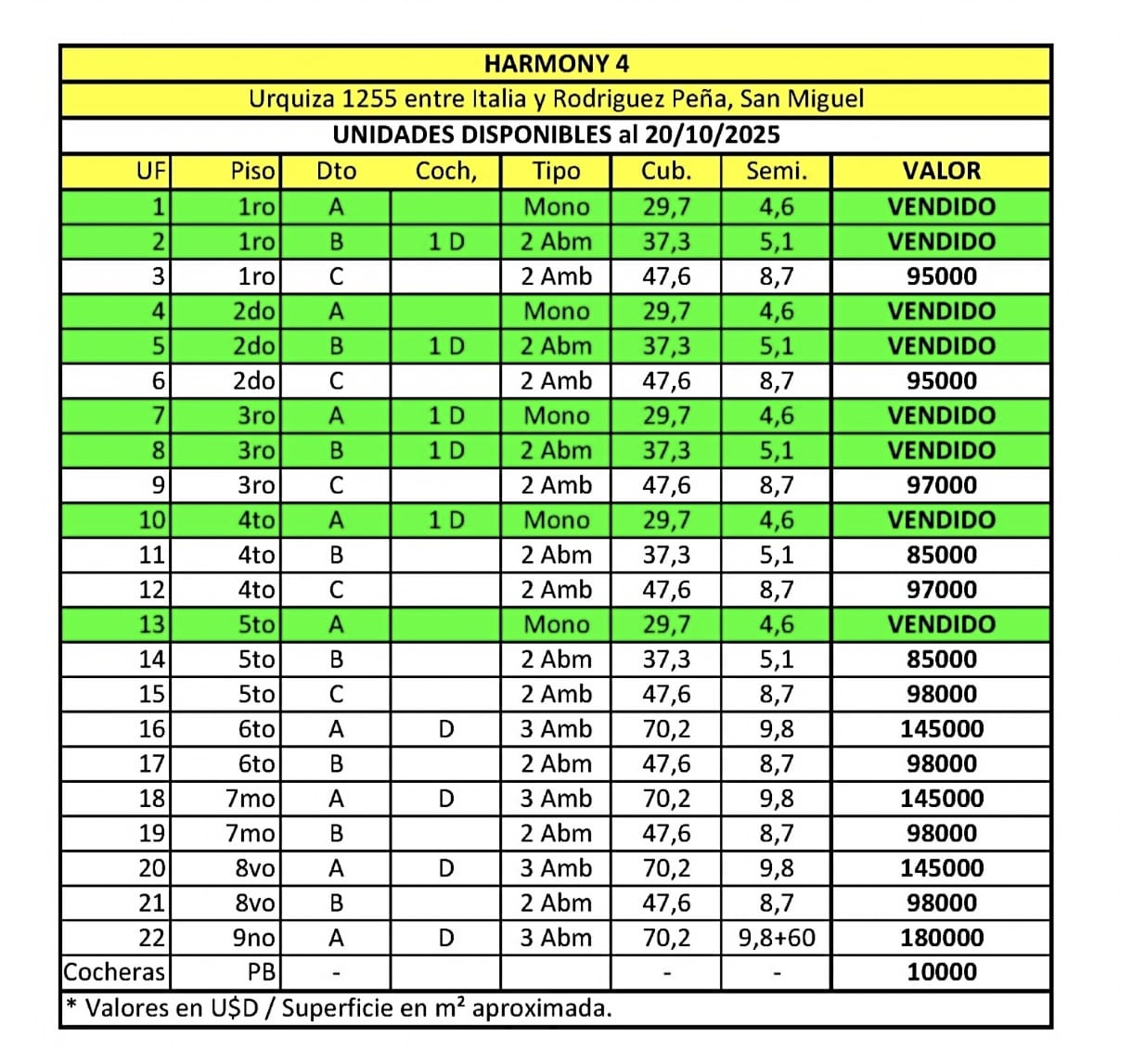El 2 ambientes frente es el mas economico y se vende en 85.000 U$S (42m2 = 37+5)